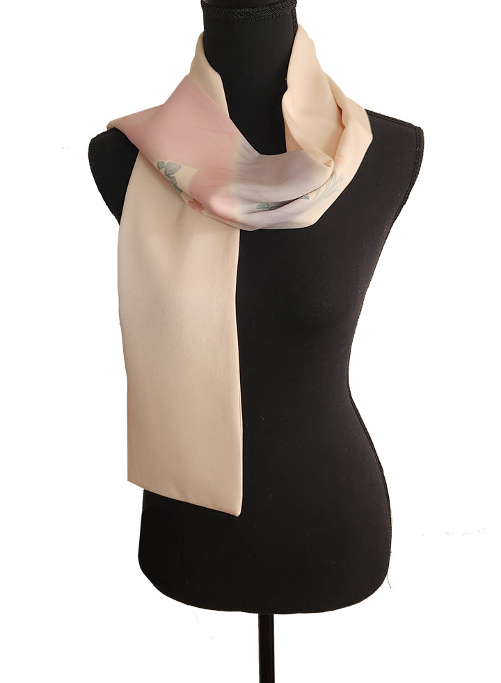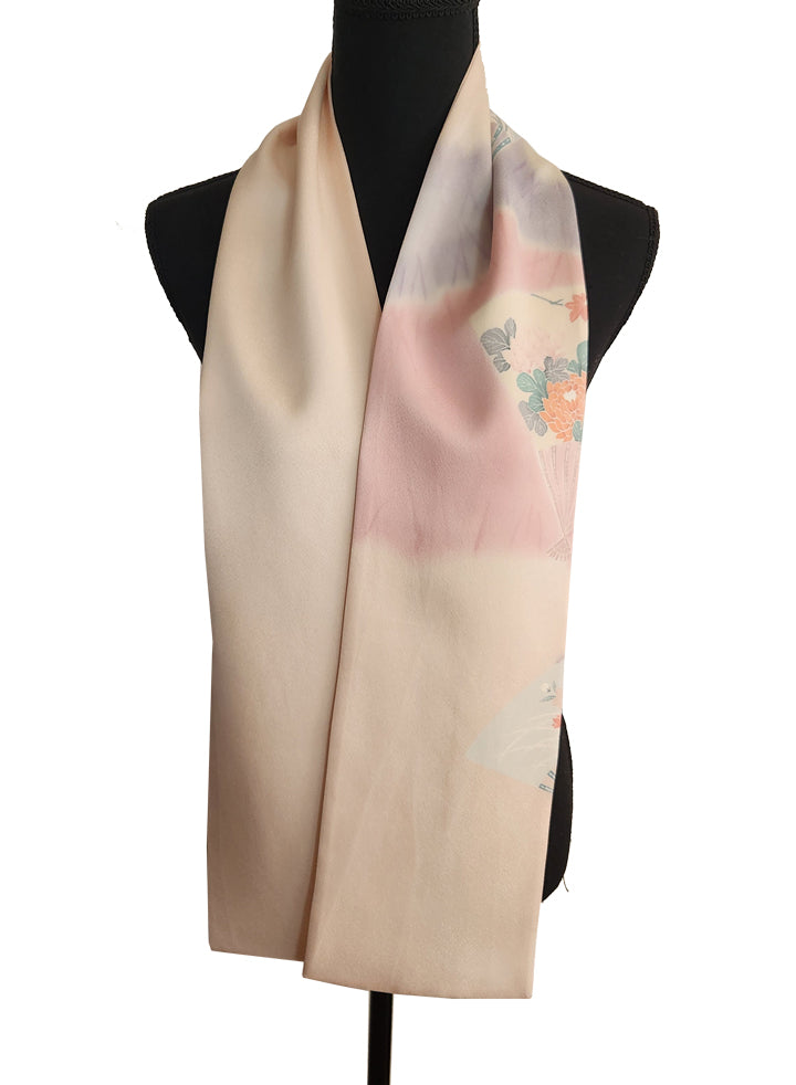 The softest of soft in a subtle pink scarf with roses and irises on muted Japanese fans.