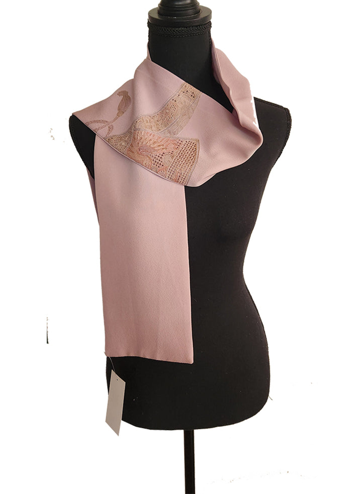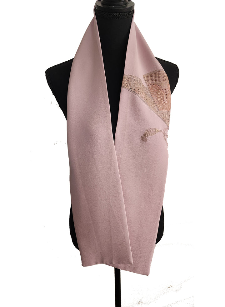 This lavender scarf features an unusual and unique filigree fan design.