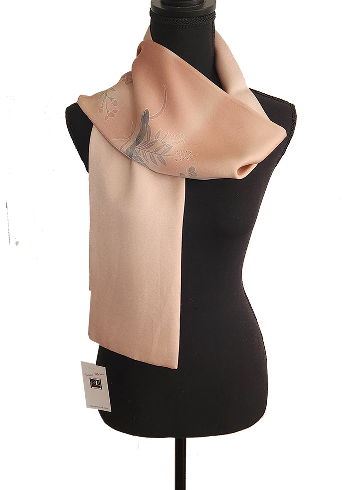 This beautiful scarf features muted shades of mauve and gray flowers against a mauve background. The scarf is made from a 100% silk scarf.