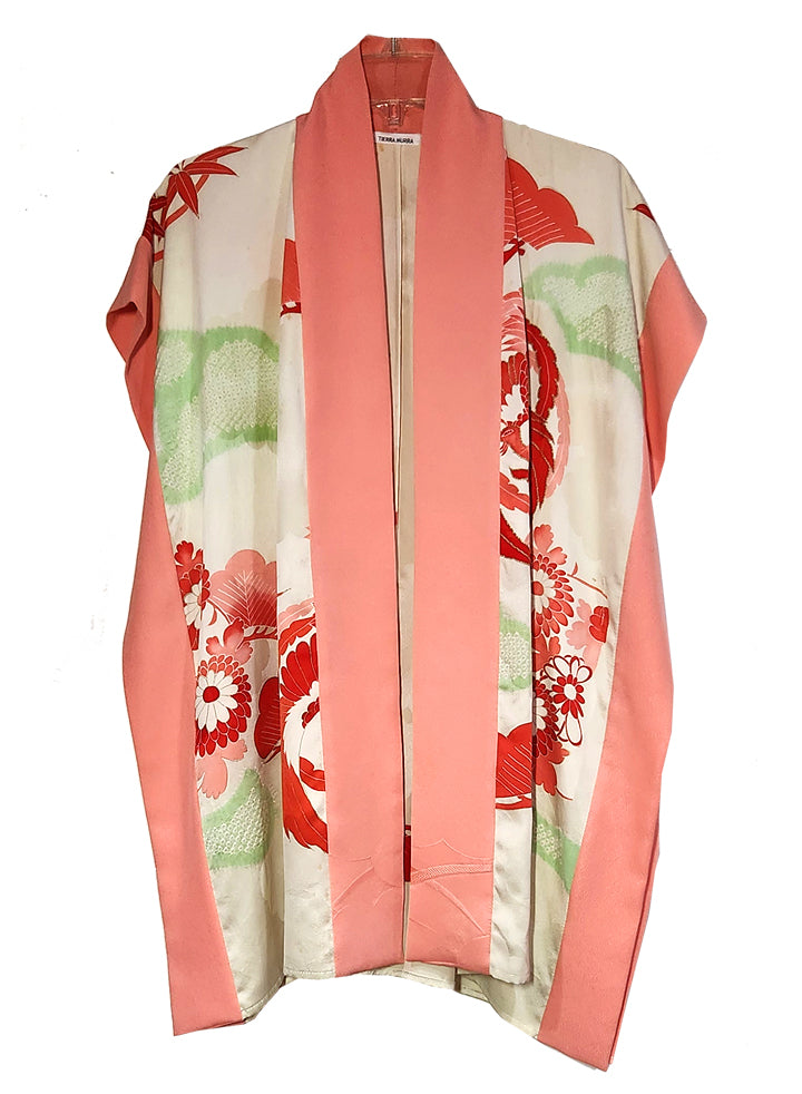 The fabric of the kimono is carefully taken apart, and washed, then dried in the cool ocean breeze. Please note, the fabric is an up-cycled kimono and may have age-appropriate light spots, some uneven color fading and abrasions adding to the character of the garment.