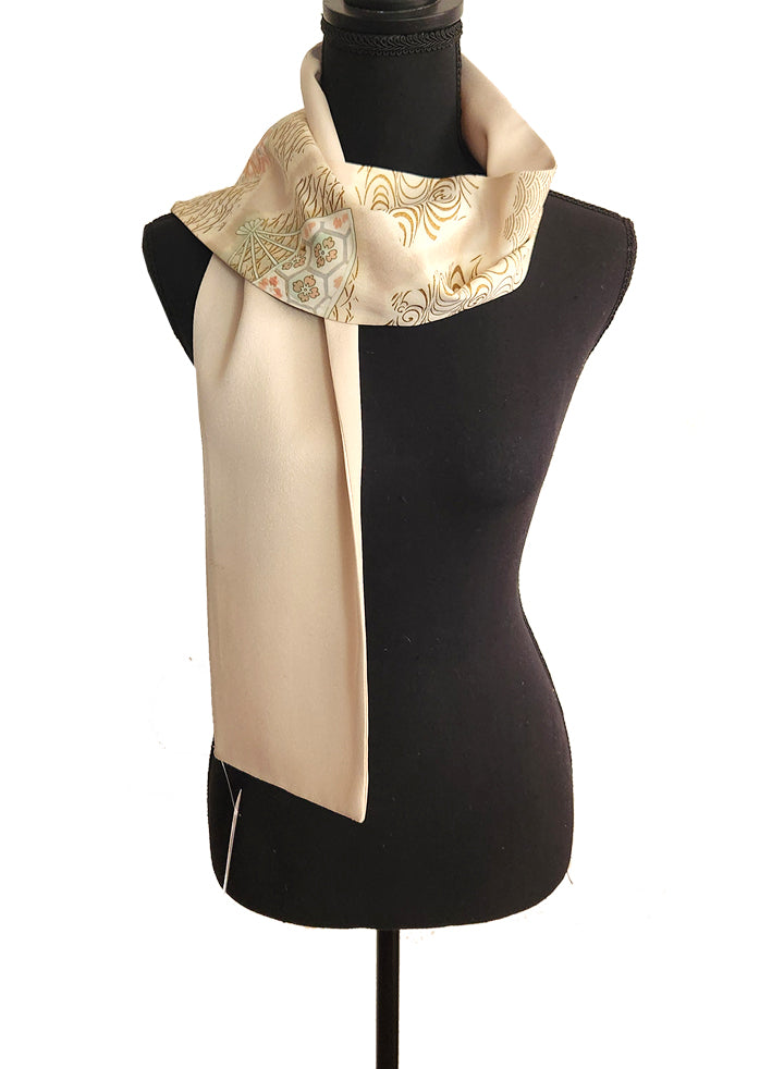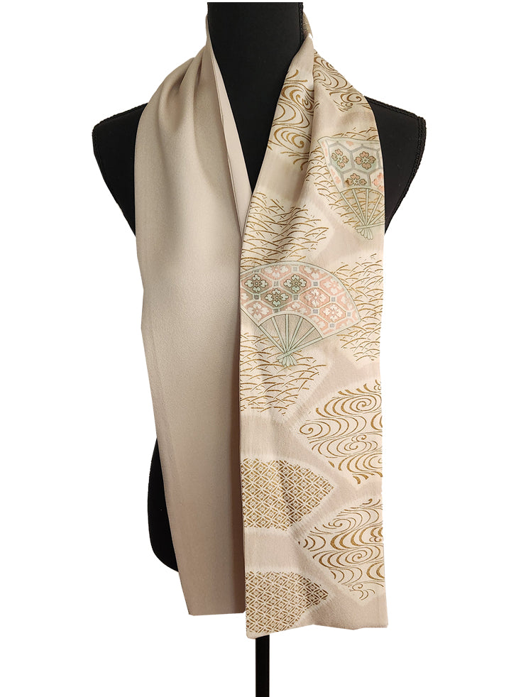 Golden swirls and whirls against background shapes of sensu (Japanese fans). The 100% silk scarf also features a colored sensu with a stitched design.