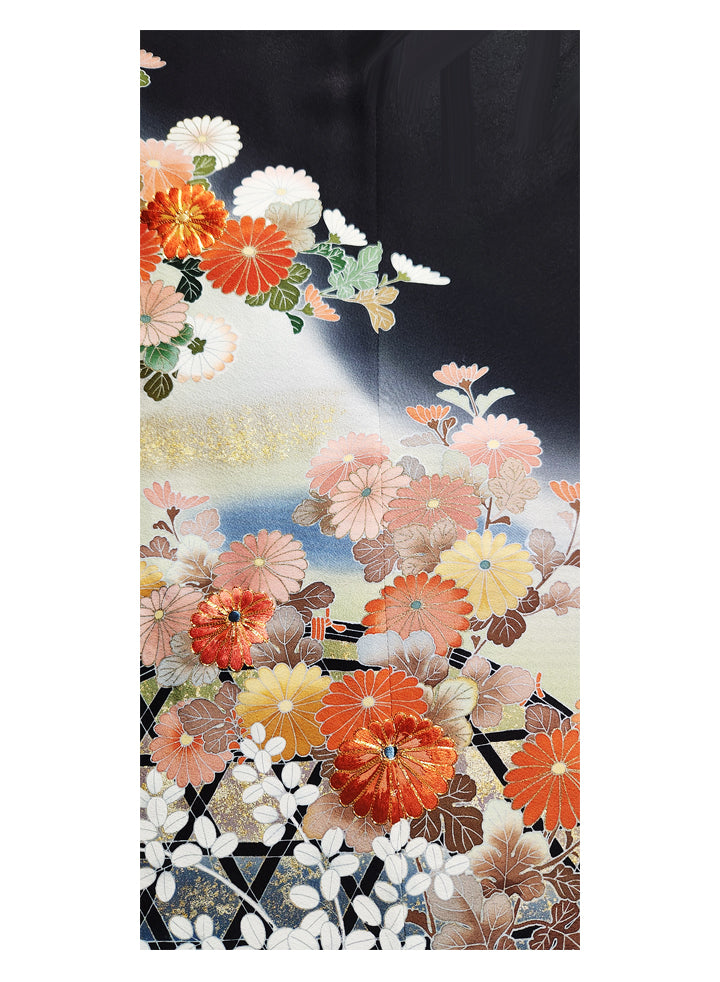 A beautiful V-back, cap-sleeved dress made from a 100% silk formal Japanese tomesode kimono. The black dress has an asymmetrical pattern of chrysanthemums in shades of white, peach and gold. There are also stitched flowers in orange with metallic highlights. The dress is fully lined.